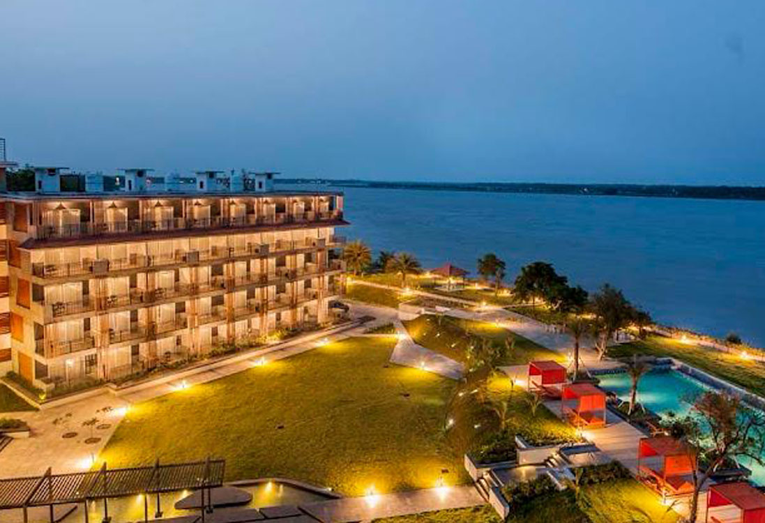 A luxury resort/hotel facility offering river-facing rooms, landscaped grounds, recreational facilities (pool, spa, lawn) and a considerable focus on aesthetic resort ambiance.