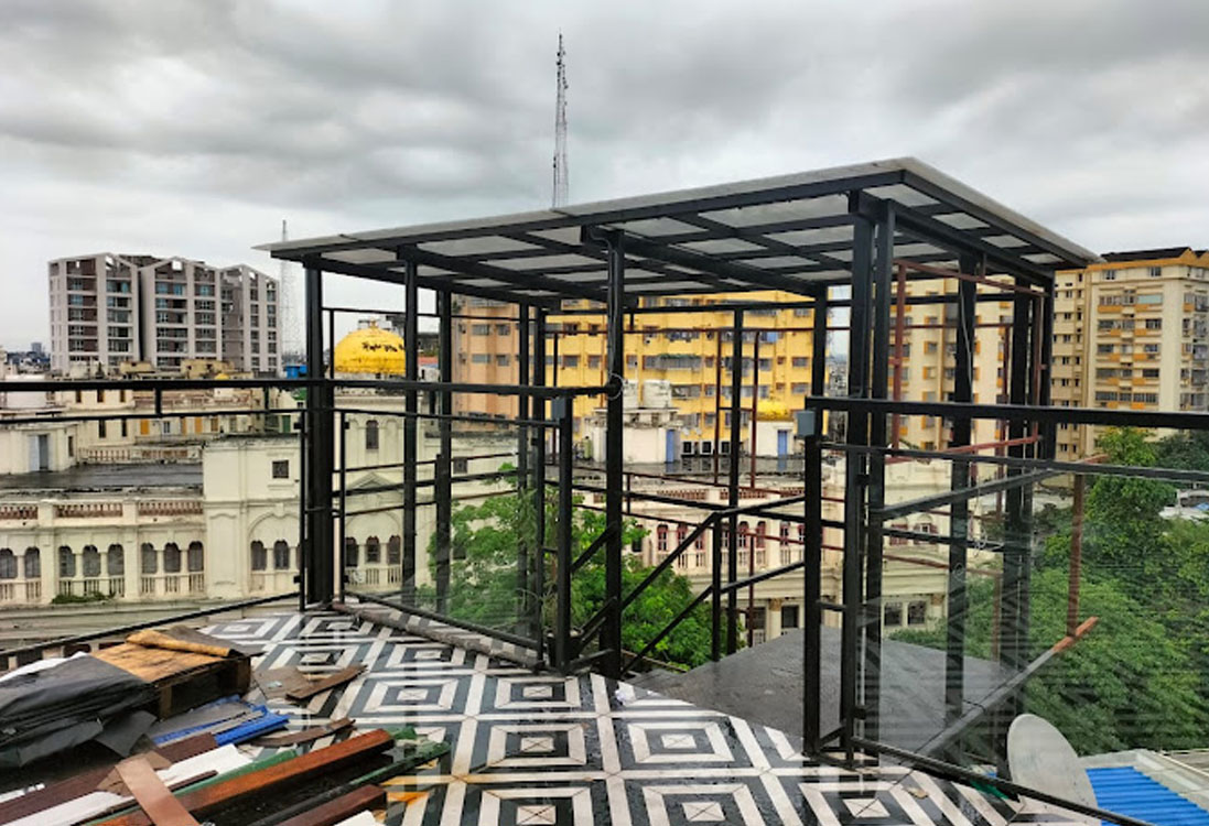 Main mild steel columns rising from the rooftop slab or platform. Because rooftop loads must be minimized, steel framing offers lighter-weight solution compared to heavy RCC., Use of mild steel (rather than highly specialized steel) helps cost-effectiveness. For example mild steel pergolas rooftop are quoted as custom mild steel structures., Bracing (mild steel rods or sections) ensure lateral stability (wind, seismic) especially on rooftop open structures.